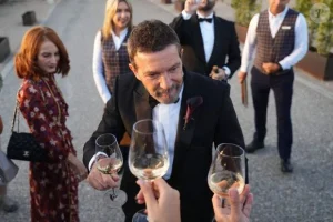 At the gates of the estate, a man in a black tuxedo raises his glass to a circle of reporters. It’s the bride’s father, Antonio Banderas. In the photos, he can be seen smiling, a flute of white wine in hand, surrounded by a maître d’ carrying a tray and an assistant holding a bottle. The procession of microphones and cameras remains at a distance; the atmosphere is light, champagnes open, knowing glances.